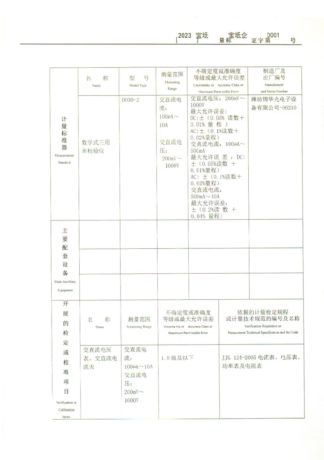 【2023】宝坻量标宝坻企证字第0001号(交直流电压,电流表检定装置)