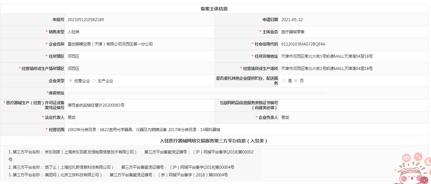 星创眼镜贸易(天津)有限公司河西区第一分公司 津西食药监械经营许20200083号