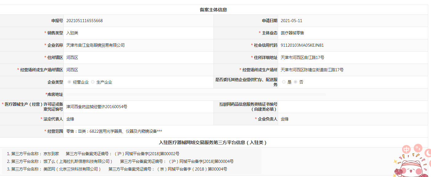 天津市曲江宝岛眼镜贸易有限公司 津河西食药监械经营许20160054号