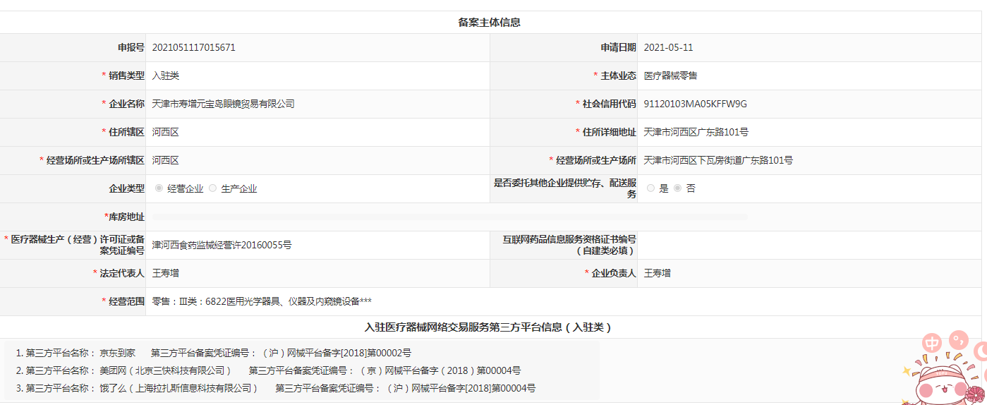 天津市寿增元宝岛眼镜贸易有限公司 津河西食药监械经营许20160055号