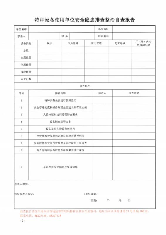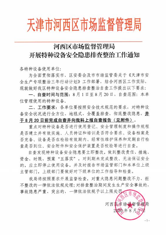 河西区市场监督管理局开展特种设备安全隐患排查整治工作通知