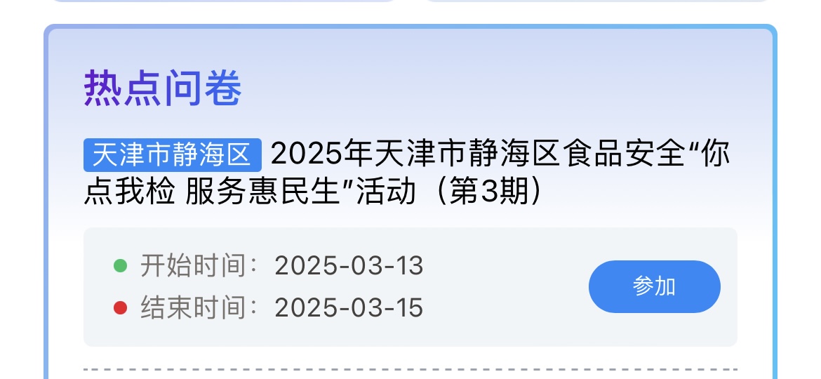 为进一步提升公众对食品安全抽检工作的关注度与参与度,提高食品安全抽检监测的针对性,营造安全放心的消费环境,在“3·15”国际消费者权益日来临之际,天津市静海区市场监管局在全区范围组织开展“百姓点检日”活动。围绕重点时段、重点食品、重点人群、重点场所等开展食品安全“你点我检 服务惠民生”活动,征集消费者最关心的食品品种、检验项目及抽样场所并进行重点抽检,有效提升食品安全抽检的精确性、针对性和实效性。欢迎您扫描下方的二维码,选择“2025年天津市静海区食品安全`你点我检 服务惠民生'活动(第3期)”,积极参与线上投票!