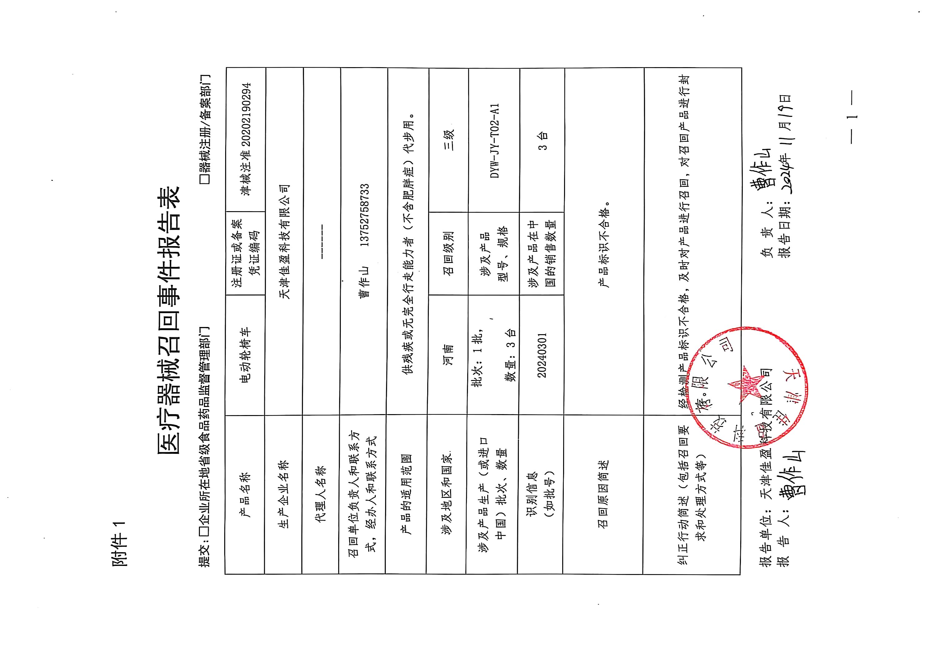 天津佳盈科技有限公司报告,由于产品标识不合格原因,天津佳盈科技有限公司对其生产的电动轮椅车(注册号:津械注准20202190294)主动召回。召回级别为三级。涉及产品的型号、规格及批次等详细信息见《医疗器械召回事件报告表》。