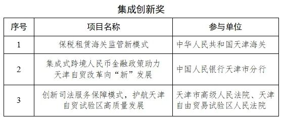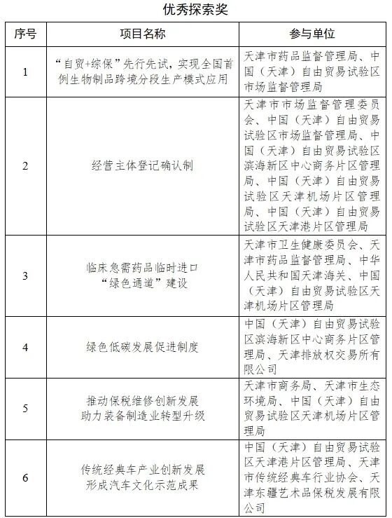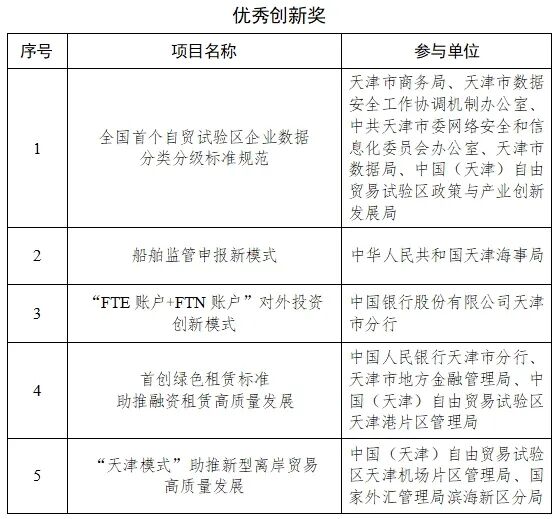 建设中国(天津)自由贸易试验区(以下简称天津自贸试验区)是党中央、国务院作出的重大决策,是在新形势下推进改革开放和加快实施京津冀协同发展战略的重要举措。天津自贸试验区作为北方第一个自贸试验区,肩负着党中央赋予的更好发挥改革开放综合试验平台作用,为全面深化改革和扩大开放探索新途径、积累新经验的重大使命。十年来,天津市坚决贯彻习近平总书记关于自贸试验区建设的重要论述,全力支持天津自贸试验区先行先试,坚持以高水平开放为引领、以制度创新为核心,探索与国际通行规则相衔接的投资贸易制度体系,统筹发展和安全,形成一大批制度创新性强、经营主体受益度高、复制推广效果好、在全国具有较大影响力的改革和制度创新成果。为表彰先进、树立榜样、鼓舞斗志,弘扬“大胆试、大胆闯、自主改”的精神,激励各部门、各单位勇担重任、拼搏进取、奋发有为,市人民政府决定,授予“保税租赁海关监管新模式”等14个项目第一届天津市自贸改革和制度创新奖,其中授予“保税租赁海关监管新模式”等3个项目集成创新奖,授予“全国首个自贸试验区企业数据分类分级标准规范”等5个项目优秀创新奖,授予“‘自贸+综保’先行先试,实现全国首例生物制品跨境分段生产模式应用”等6个项目优秀探索奖。希望受到表彰的项目参与单位进一步发挥模范引领作用,肩负起在更广领域、更深层次开展探索的重任,在新征程上勇挑重担、冲锋在前,再接再厉、再立新功。全市各部门、各单位要全面贯彻落实习近平总书记关于对外开放的重要论述和视察天津重要讲话精神,以受表彰的先进典型为榜样,以实施自由贸易试验区提升战略为契机,加强主动谋划和系统设计,开展更大程度压力测试,为全面提升天津自由贸易试验区制度型开放水平、系统性改革成效、开放型经济质量,奋力谱写中国式现代化天津篇章作出新的更大贡献。附件:第一届天津市自贸改革和制度创新奖表彰项目名单天津市人民政府