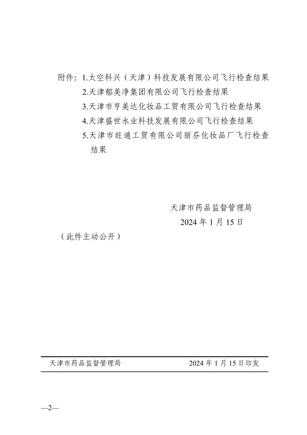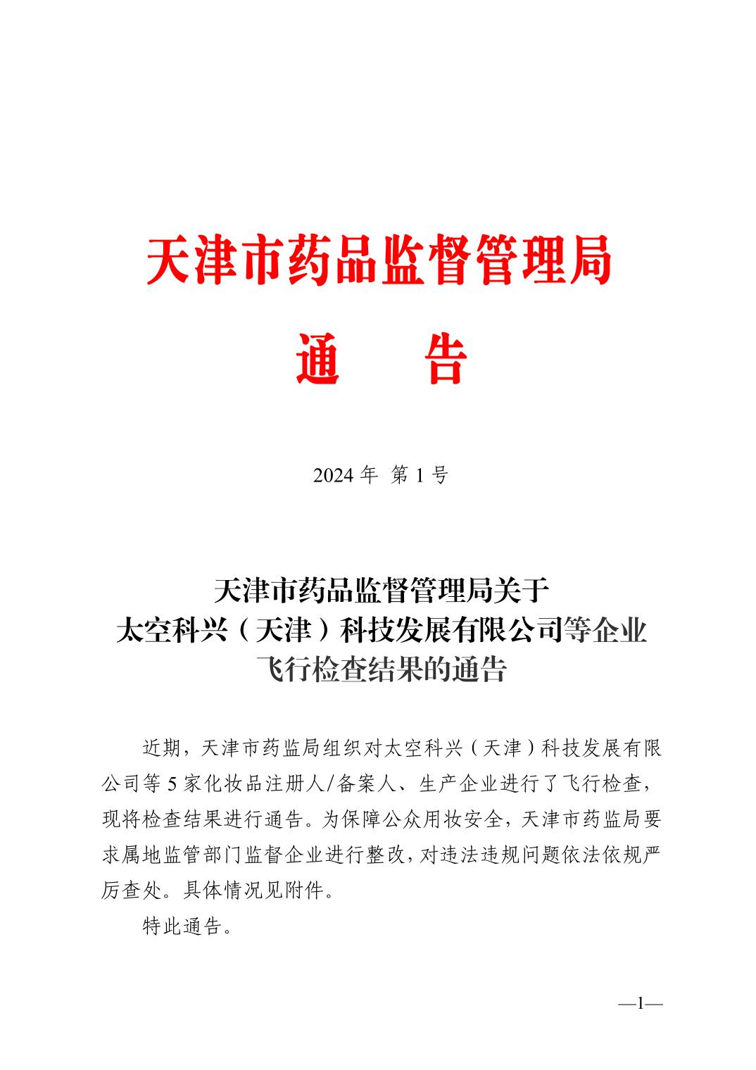天津市药品监督管理局关于太空科兴(天津)科技发展有限公司等企业飞行检查结果的通告