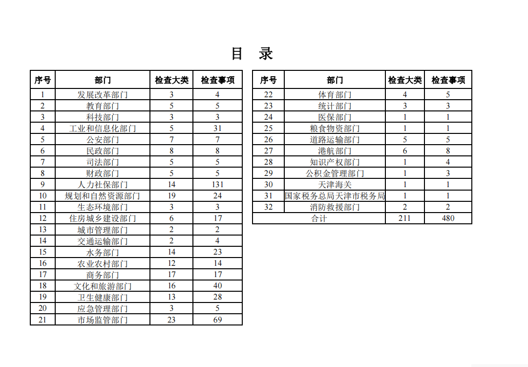 《天津市随机抽查事项清单(2022年版)》已更新完成,共涉及全市32个部门,包含211个检查大类、480个检查事项,现予以发布。