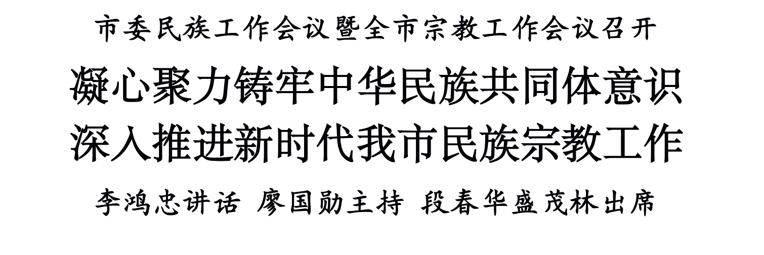 25日,市委民族工作会议暨全市宗教工作会议在天津礼堂召开,认真学习贯彻习近平总书记在中央民族工作会议、全国宗教工作会议上的重要讲话和会议精神,研究部署新时代我市民族和宗教工作。市委书记李鸿忠出席并讲话,市委副书记、市长廖国勋主持,市人大常委会主任段春华、市政协主席盛茂林出席。