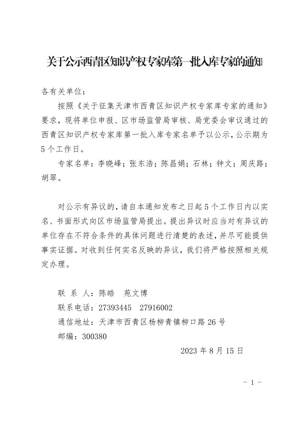 关于公示西青区知识产权专家库第一批入库专家的通知